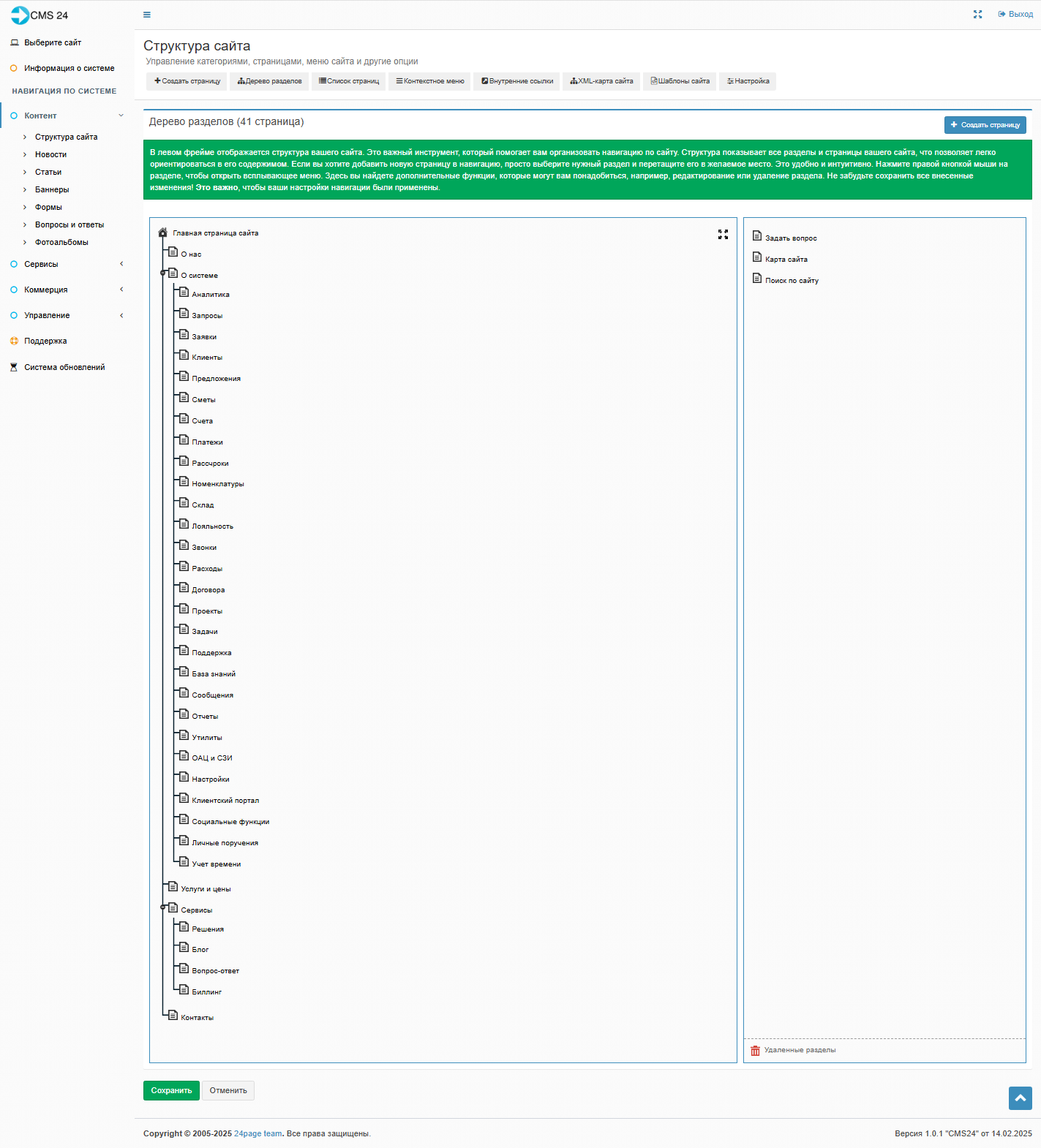 - Структура сайта: Древовидная интуитивно понятная структура для легкого управления страницами.